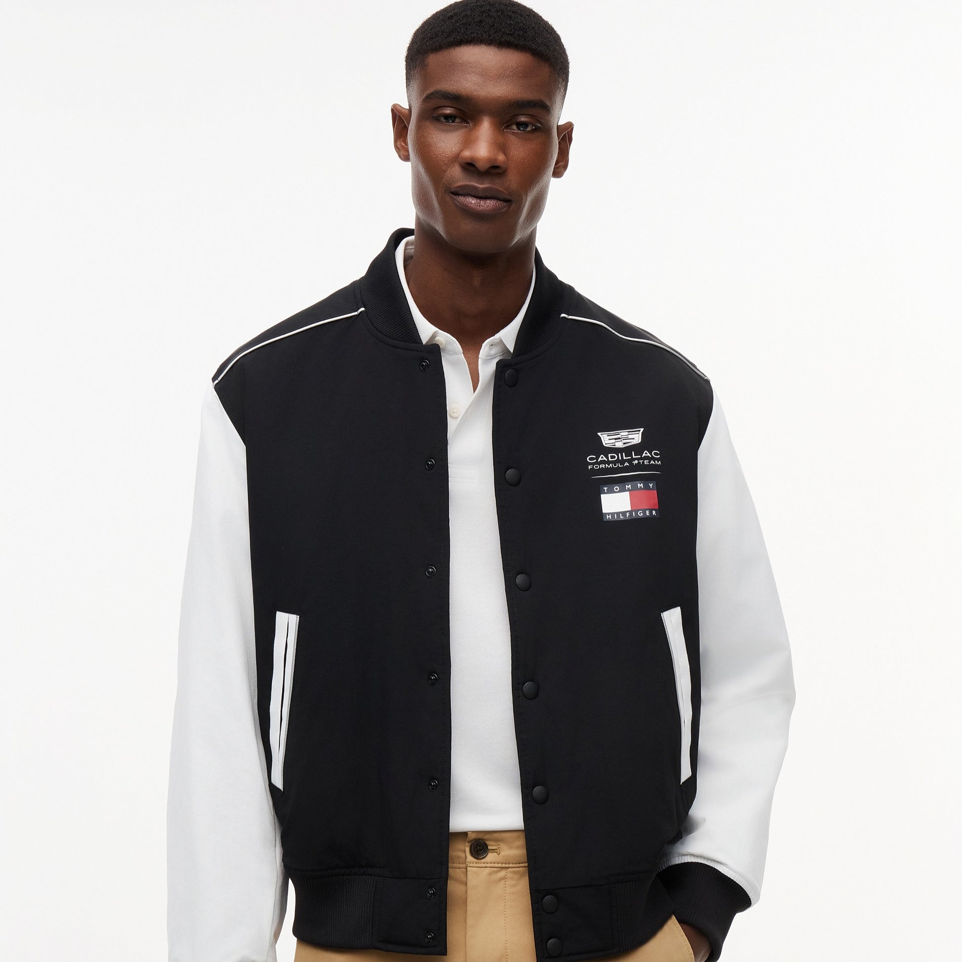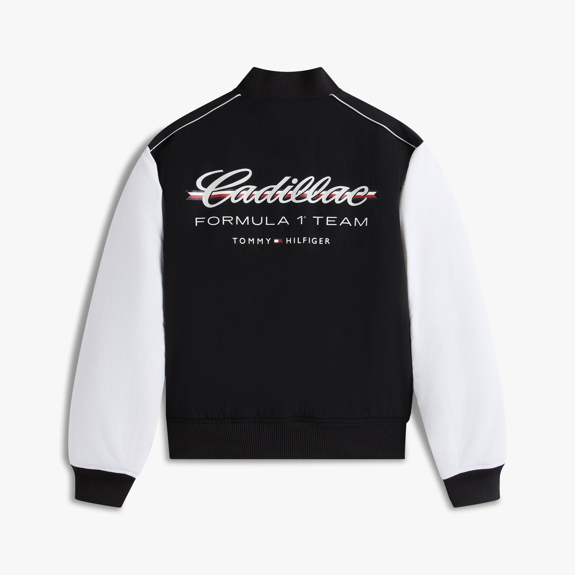 Stand out in American motorsport‑inspired fashion with the Cadillac F1 x Tommy Hilfiger Bomber Jacket for Men in striking black and white. This premium men’s jacket combines classic bomber styling with bold Tommy Hilfiger x Cadillac Formula 1 Team branding for a standout, contemporary look.