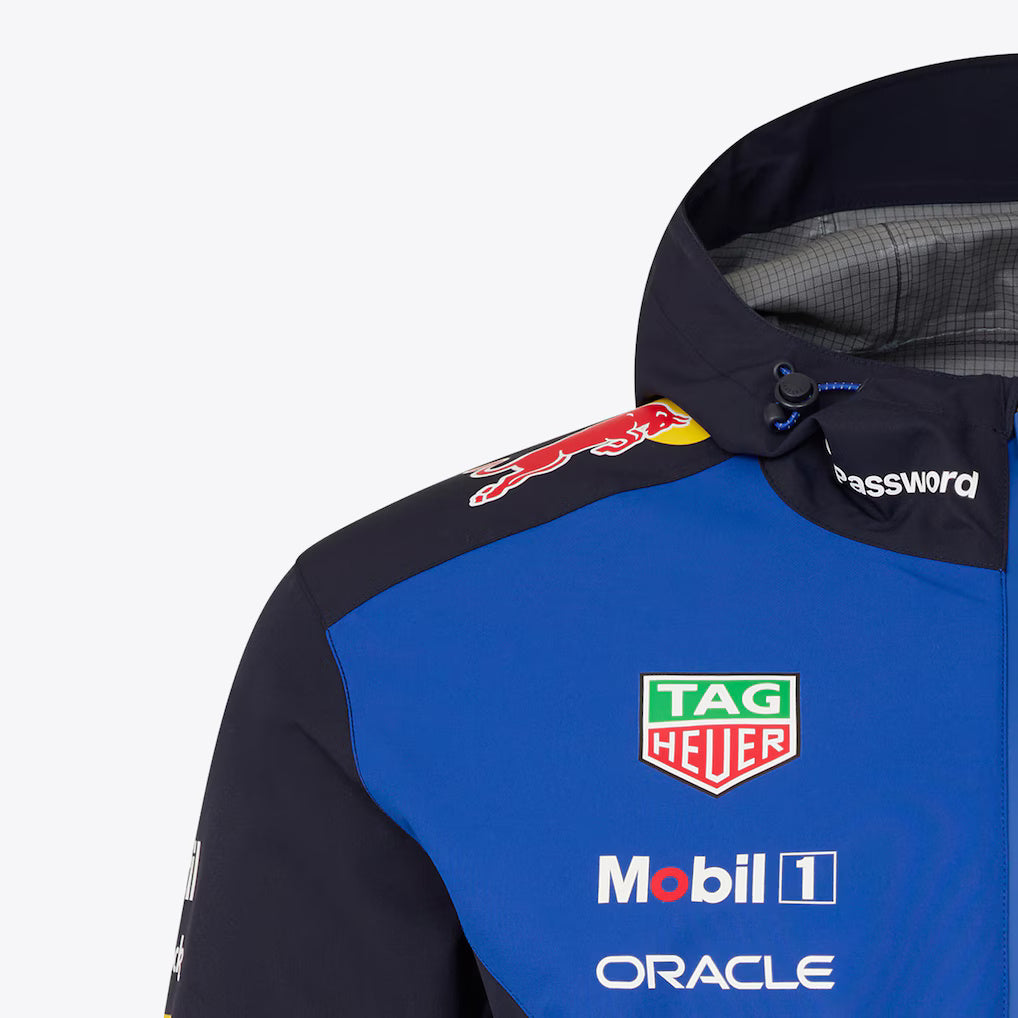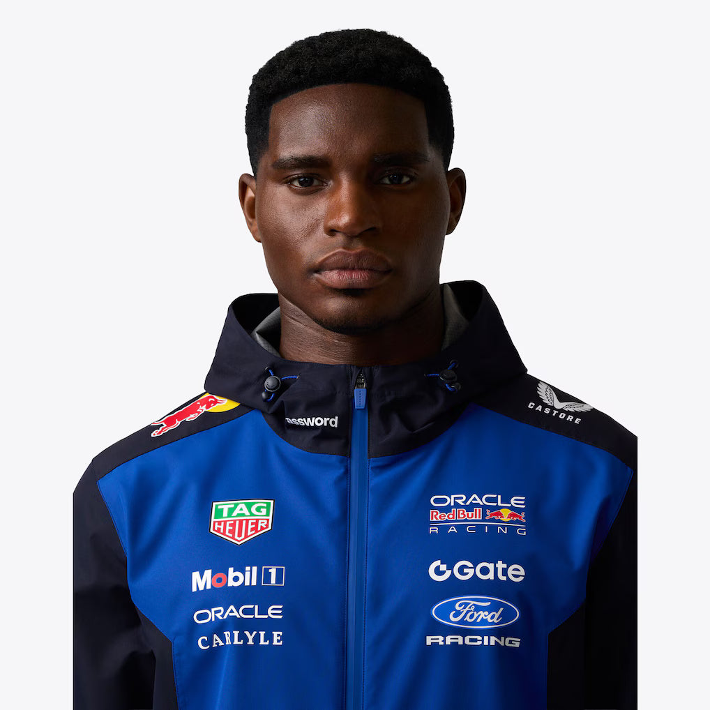 Defy race day rain in the Oracle Red Bull Racing 2026 Team Long Sleeve Water Resistant Jacket. Engineered with ProTek technology for a durable water repellent finish and a peaked hood for added protection, it provides reliable coverage in heavy showers. Finished in a modern colourway, the jacket combines style with bold Oracle Red Bull Racing branding.