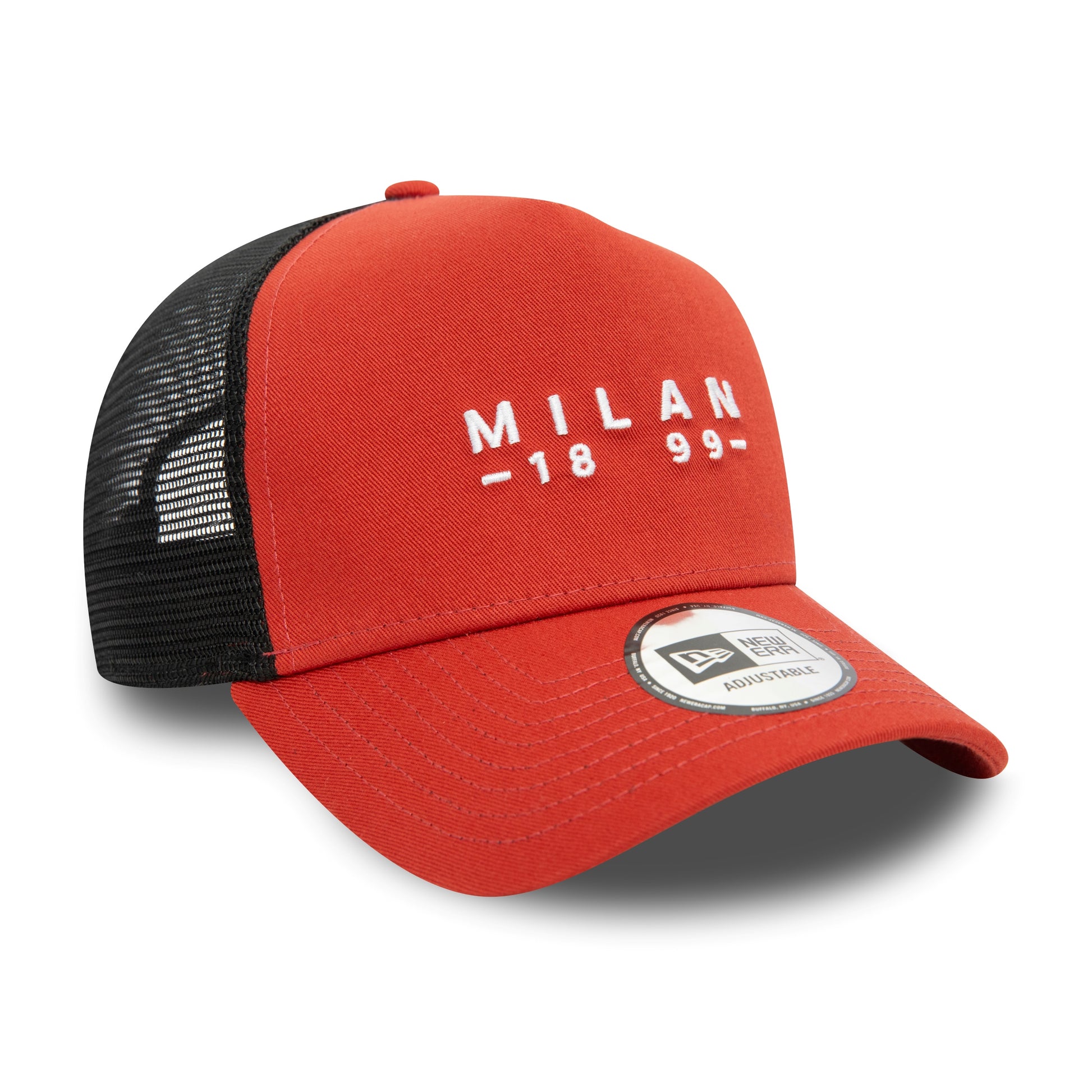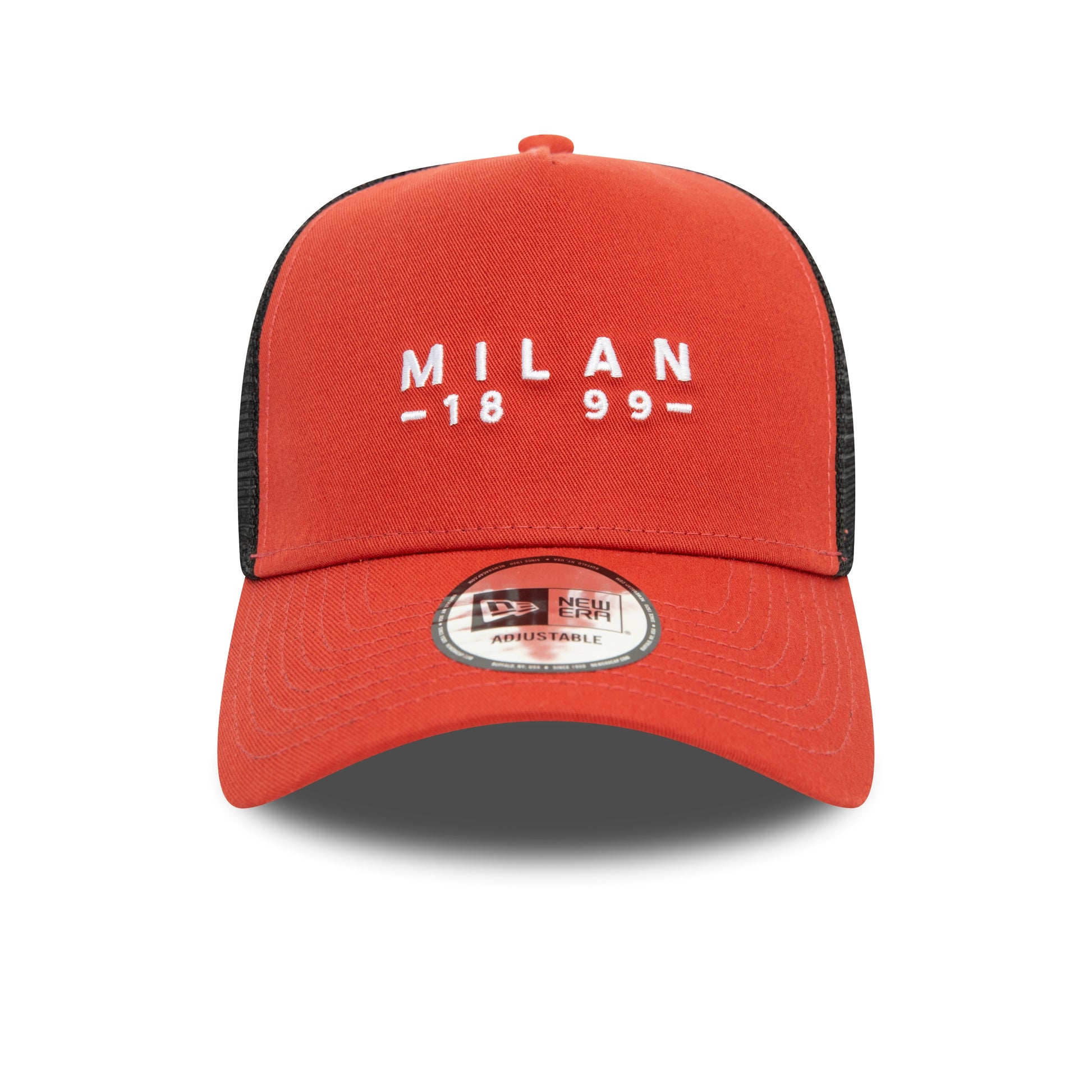 AC Milan wordmark logo on this rusty red trucker cap. Made by and featuring the New Era Flag.