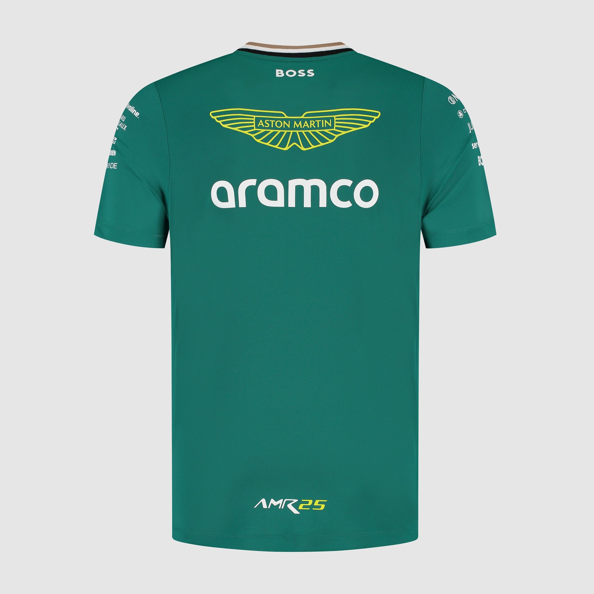 Aston Martin F1 Team Tee. The classic T-Shirt is back with a new design. Hugo Boss stripe details, team and partner logos and finished in polyester and elastine for extra stretch and comfort.
