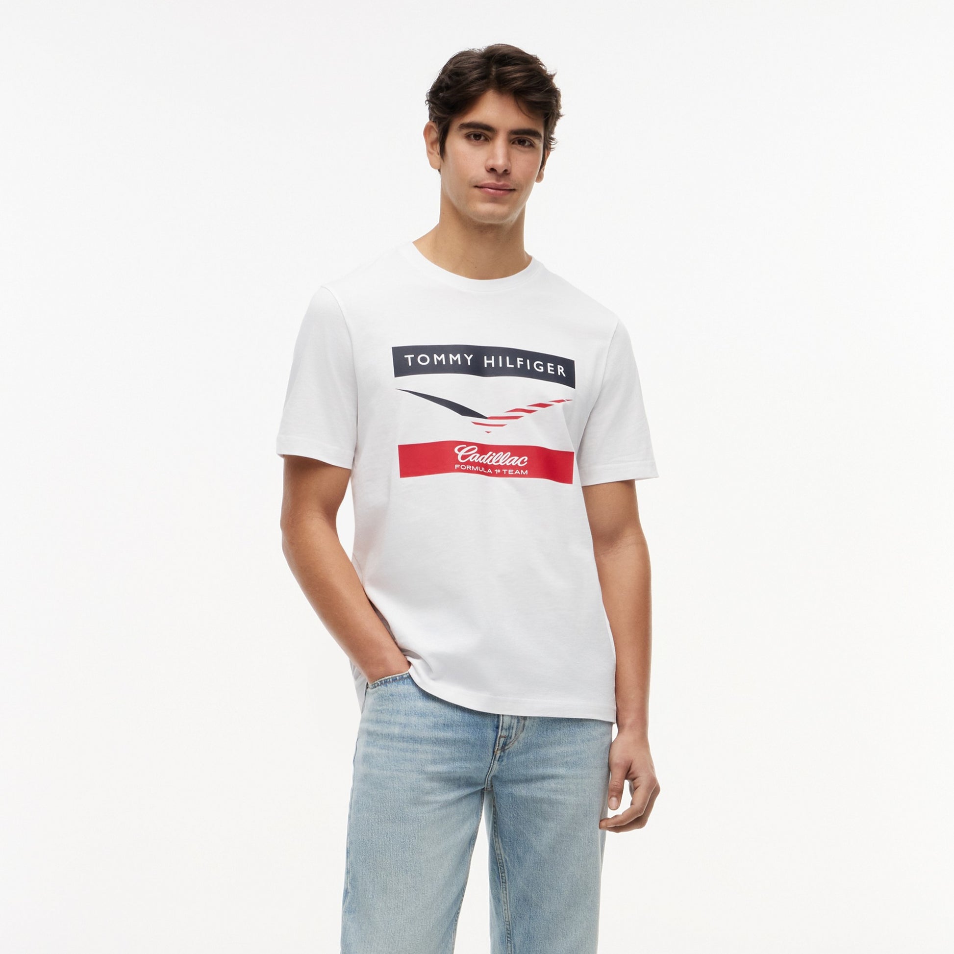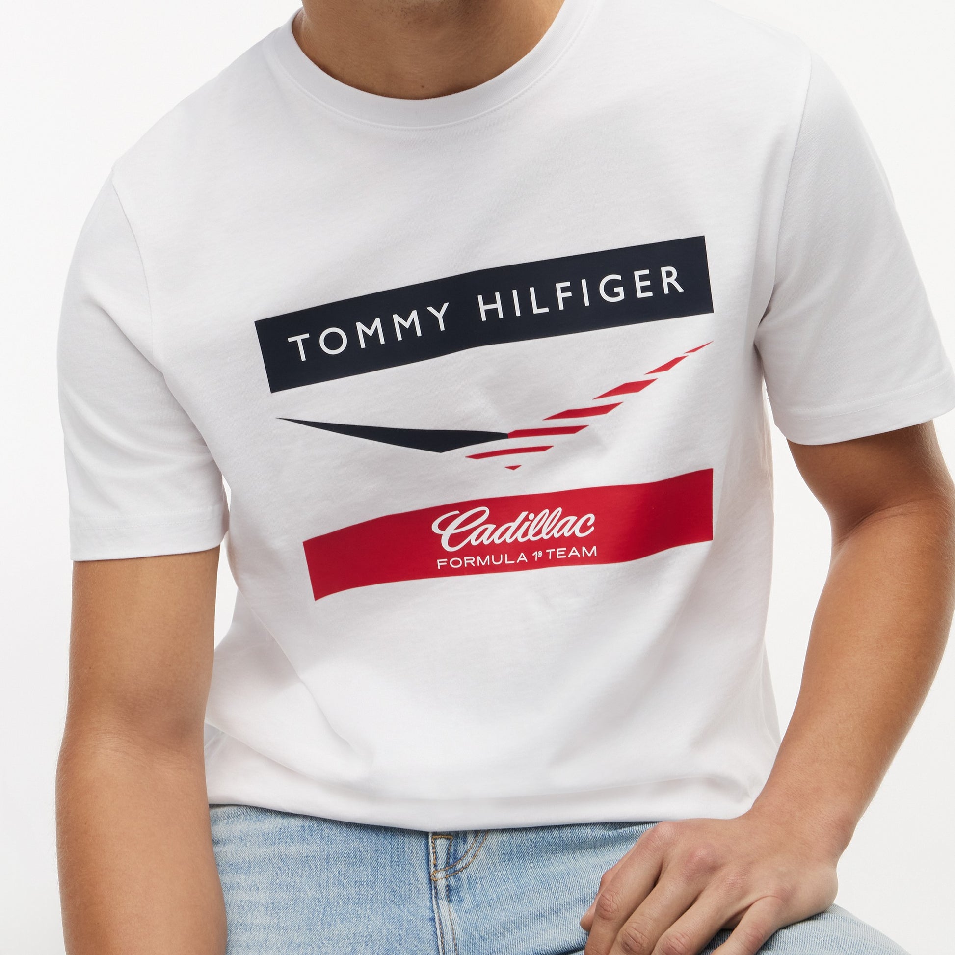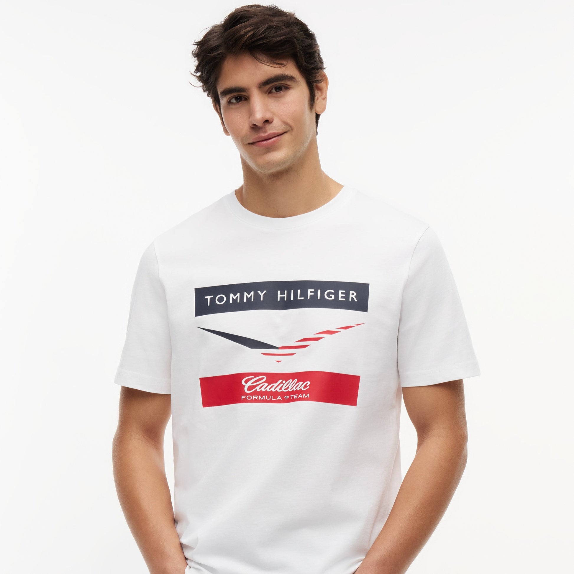 Made from soft, breathable cotton with a comfortable regular fit, it features a bold chevron graphic and official Tommy Hilfiger x Cadillac Formula 1 Team branding for authentic racing appeal.