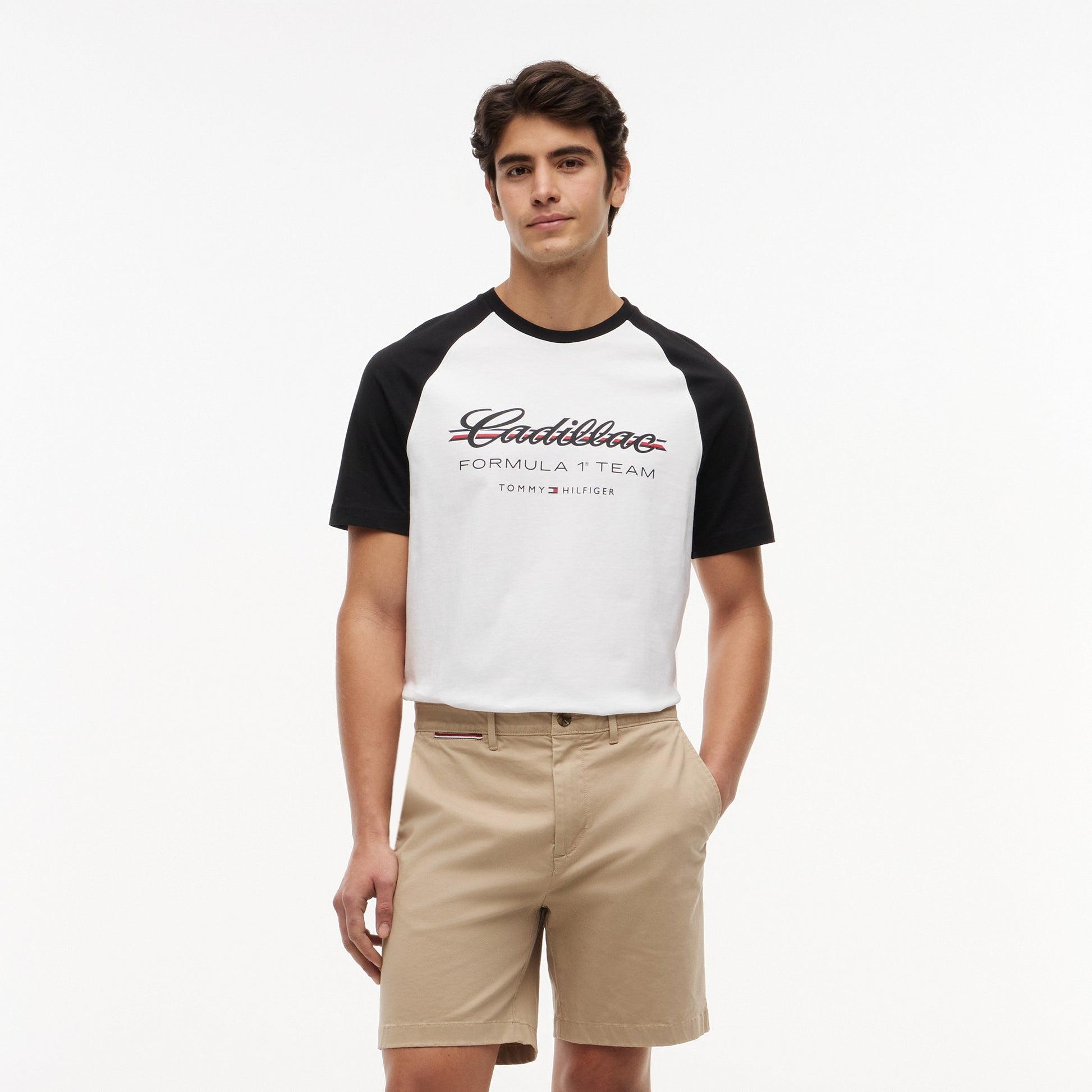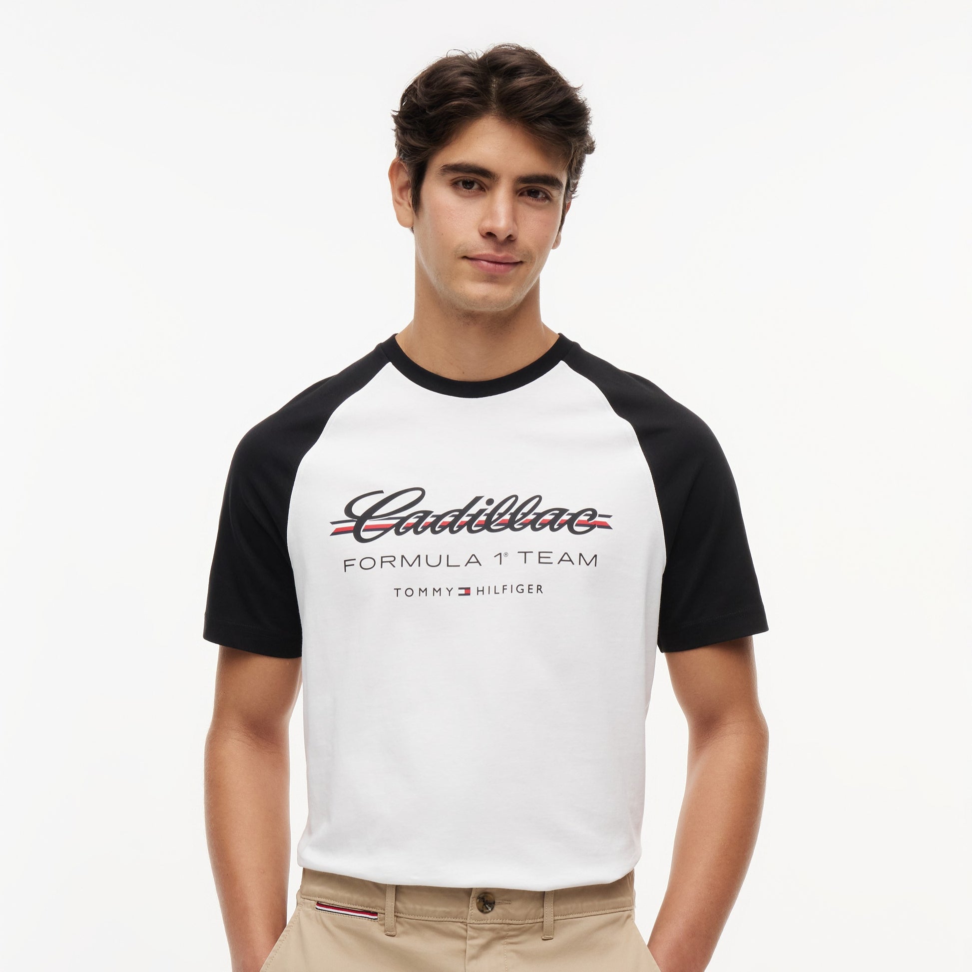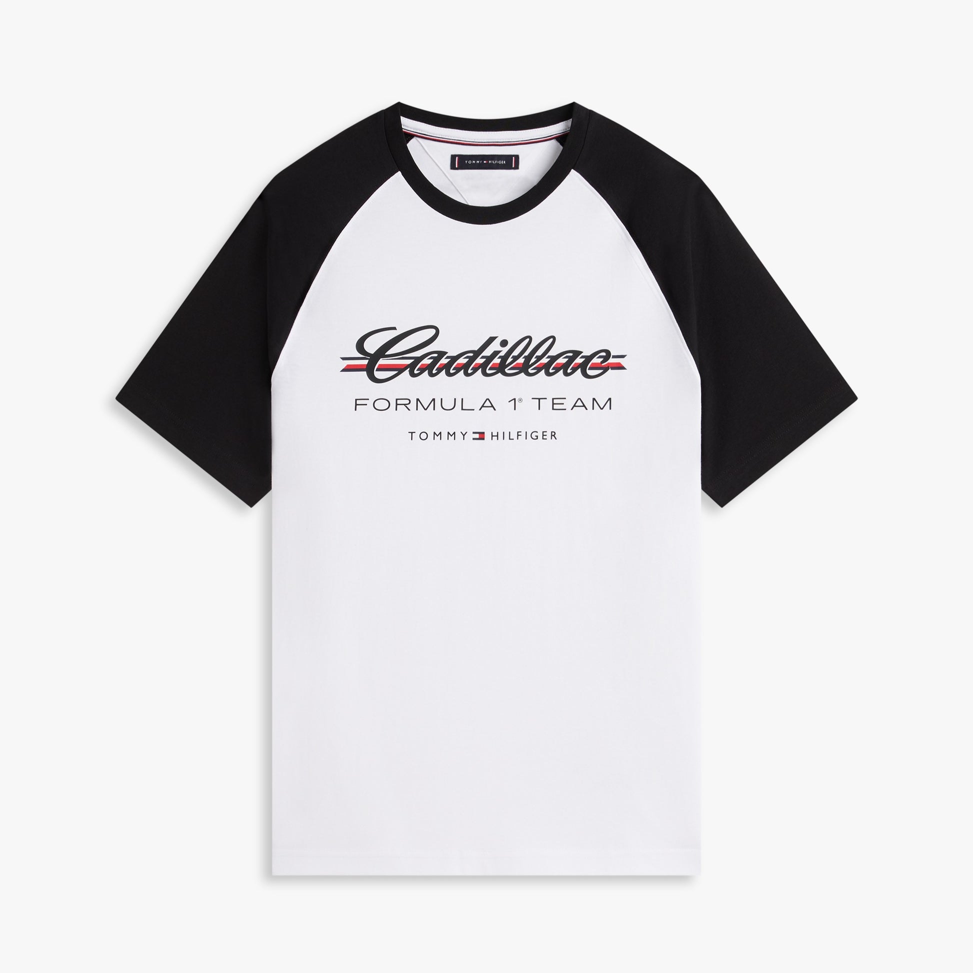Show your American motorsport allegiance with the Cadillac F1 x Tommy Hilfiger Ringer Tee for Men in classic white with black trim. This premium men’s T‑shirt blends retro ringer style with bold Tommy Hilfiger x Cadillac Formula 1 Team branding for a standout, sporty look.